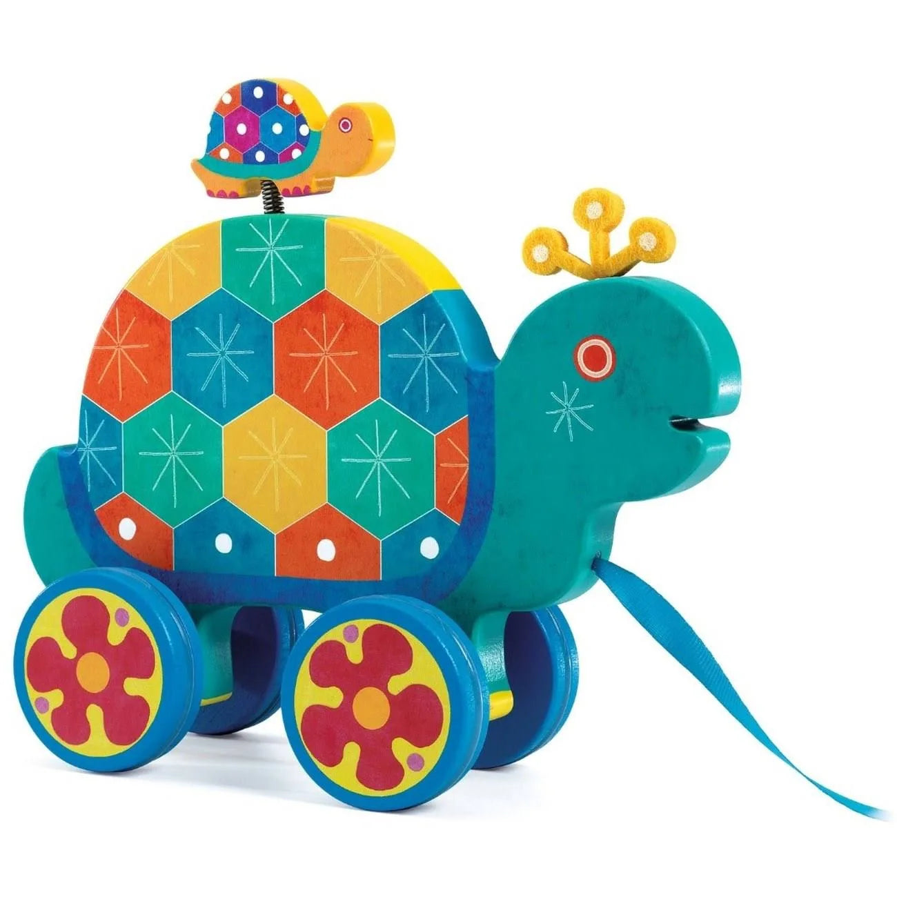 Gaspard la tortuga es un juguete de arrastre con forma de tortuga con una pequeña tortuga en la espalda. Se bambolea al pasearlo tirando de la cinta.