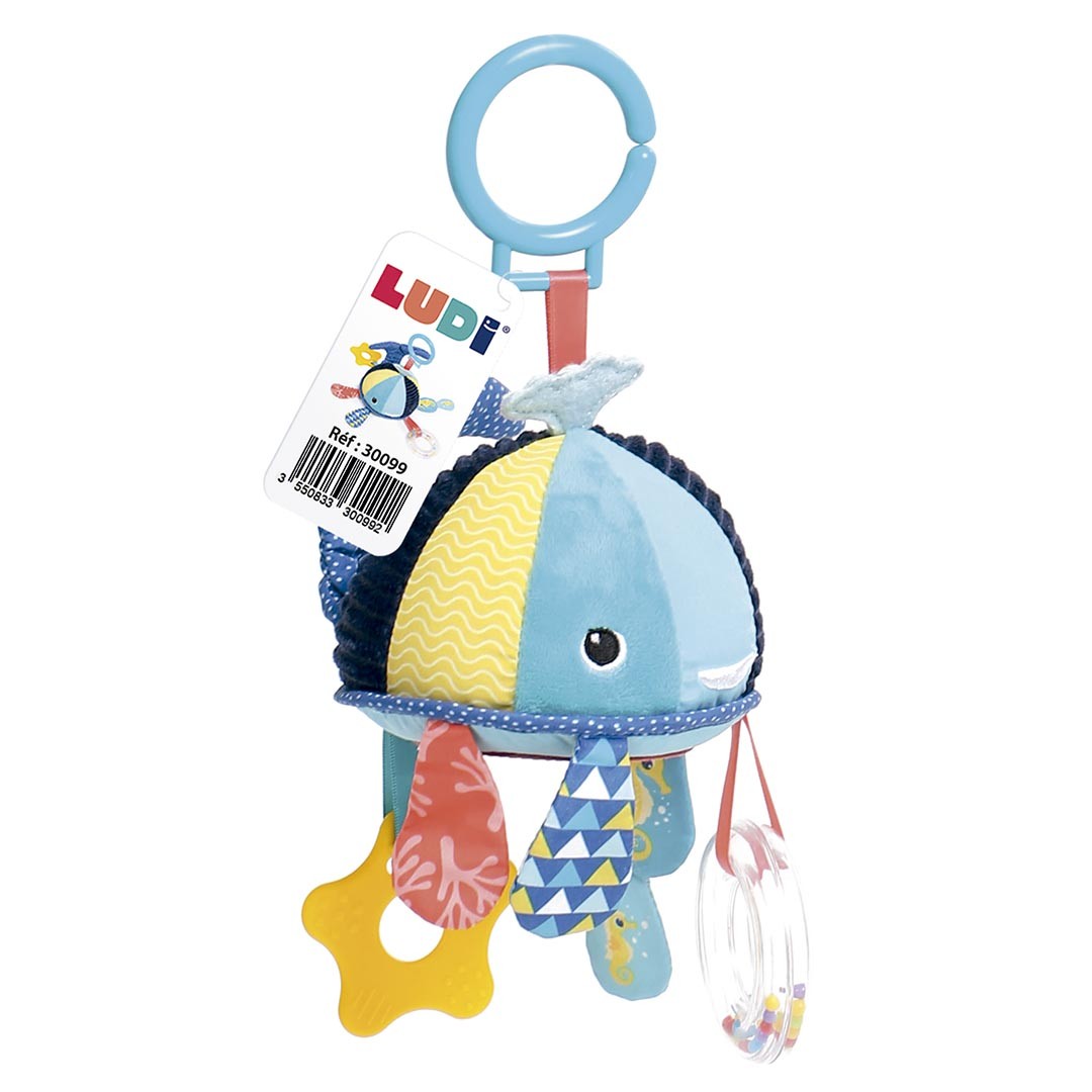 Divertida ballena de actividades para colgar y no parar de jugar. Anilla, espejo, mordedor, texturas... el juguete perfecto para que los pequeños de la casa disfruten jugando.