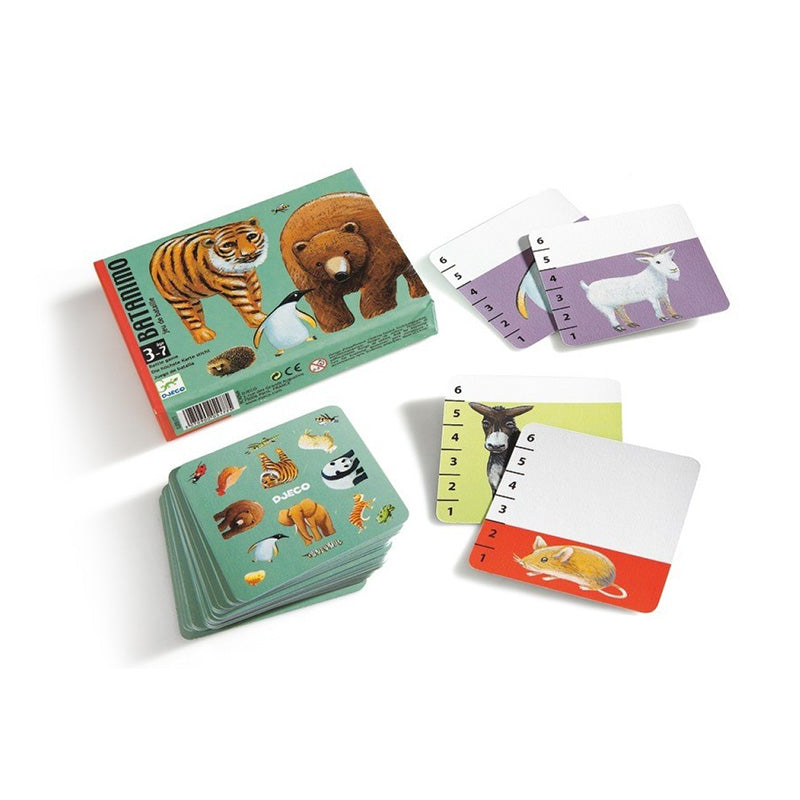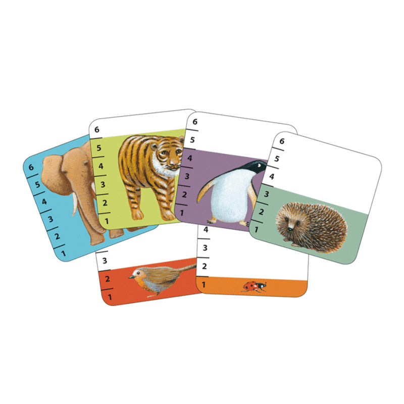 Desarrollo del juego:¡1, 2, 3! Todos los jugadores giran una carta de su mazo y se trata de observar cuál es el número más grande o el animal más grande, el jugador que lo haya sacado, es el que se queda con todas las cartas y se las coloca debajo de su mazo.
