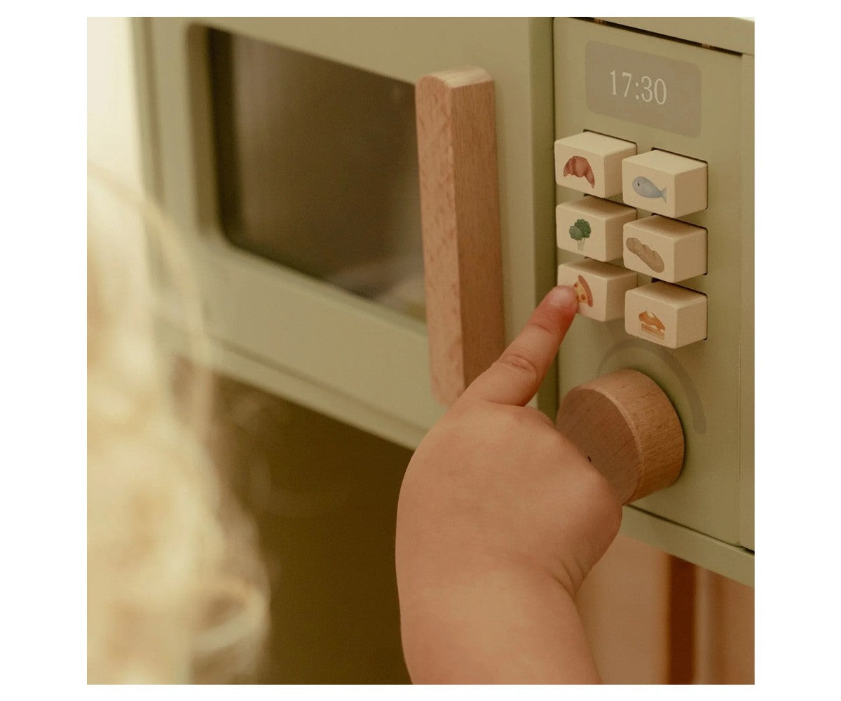 También incluye una botella de aceite de oliva y un juego de sal y pimienta. El microondas tiene perillas reales con ilustraciones para mayor diversión.