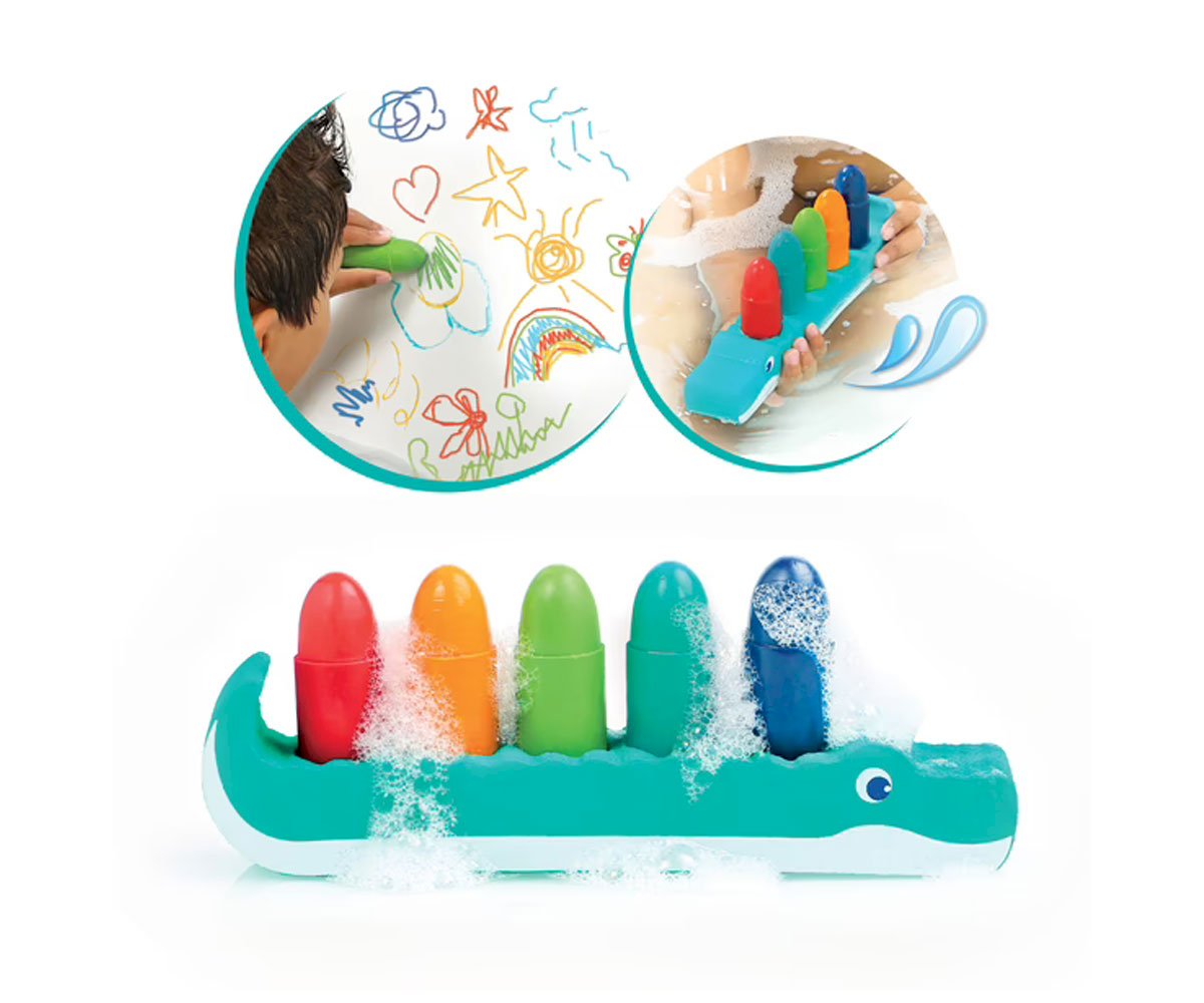 Son muy fácil de limpiar con unas pocas pasadas de esponja. Además incluye un estuche de espuma suave con forma de cocodrilo para guardarlos después de su uso. El cocodrilo podrá servir como juguete flotante durante el baño.