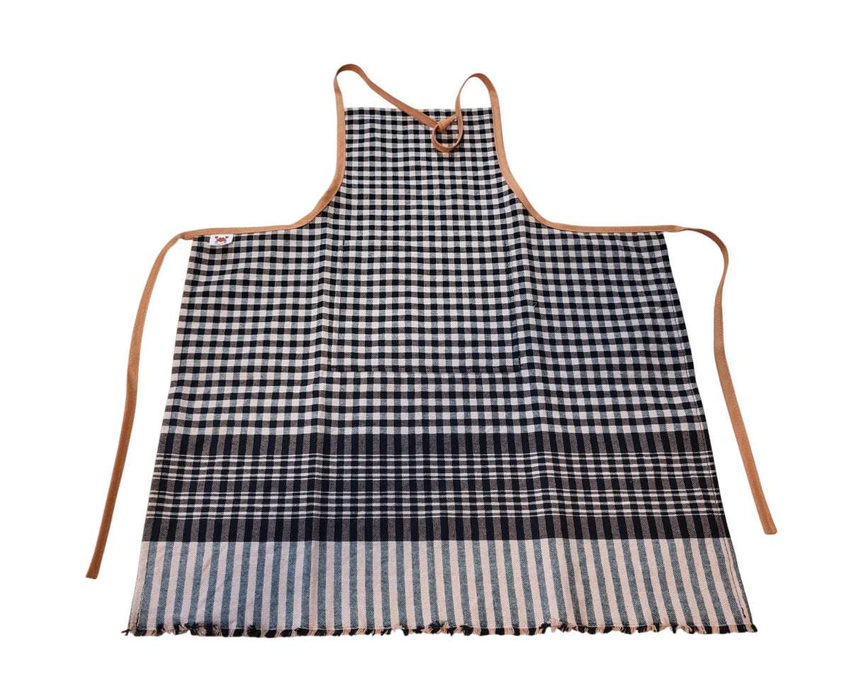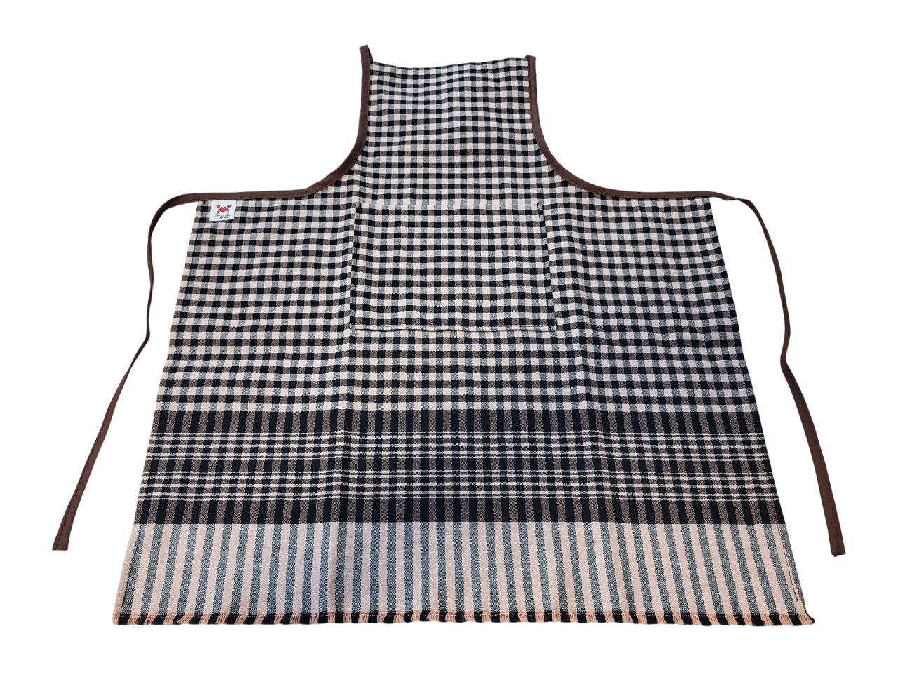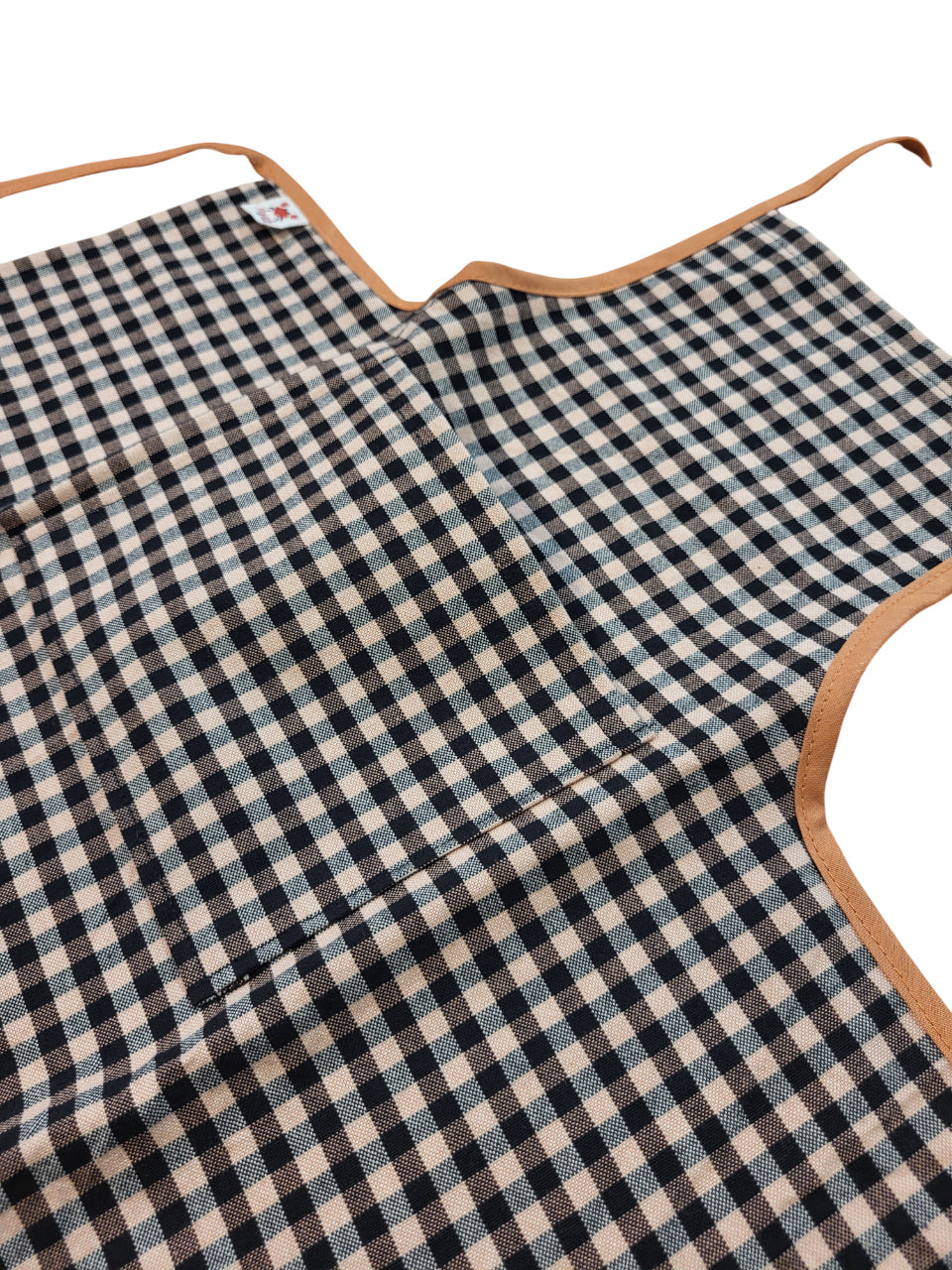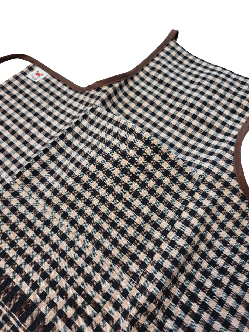 Davantal infantil de peto amb estampat de quadrets i una butxaca frontal.