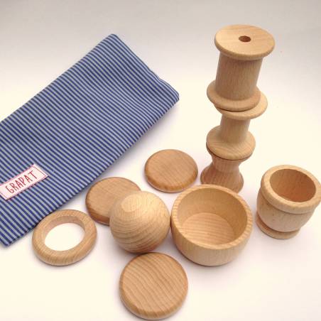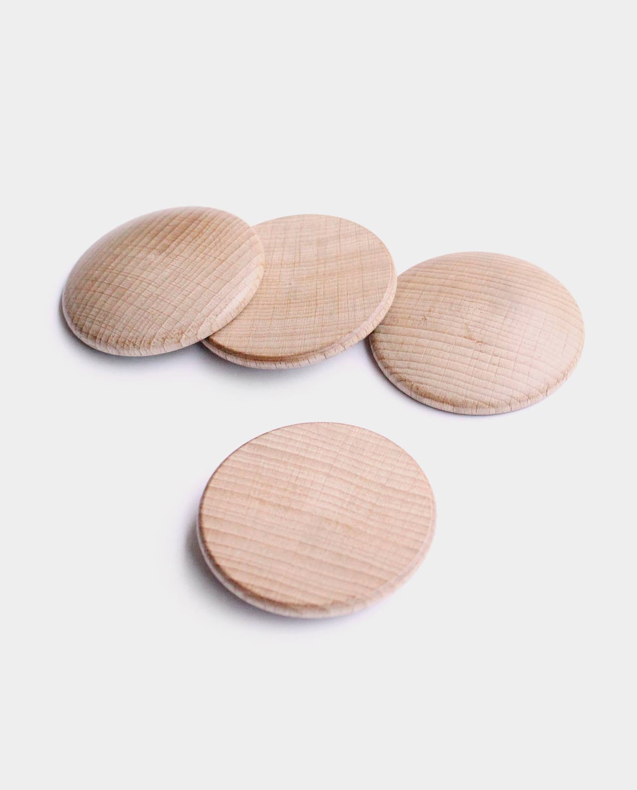Discos de madera natural planos. Pueden morderlos, hacerlos rodar e ir a buscarlos, usarlos junto a la caja de permanencia, hacer montones...