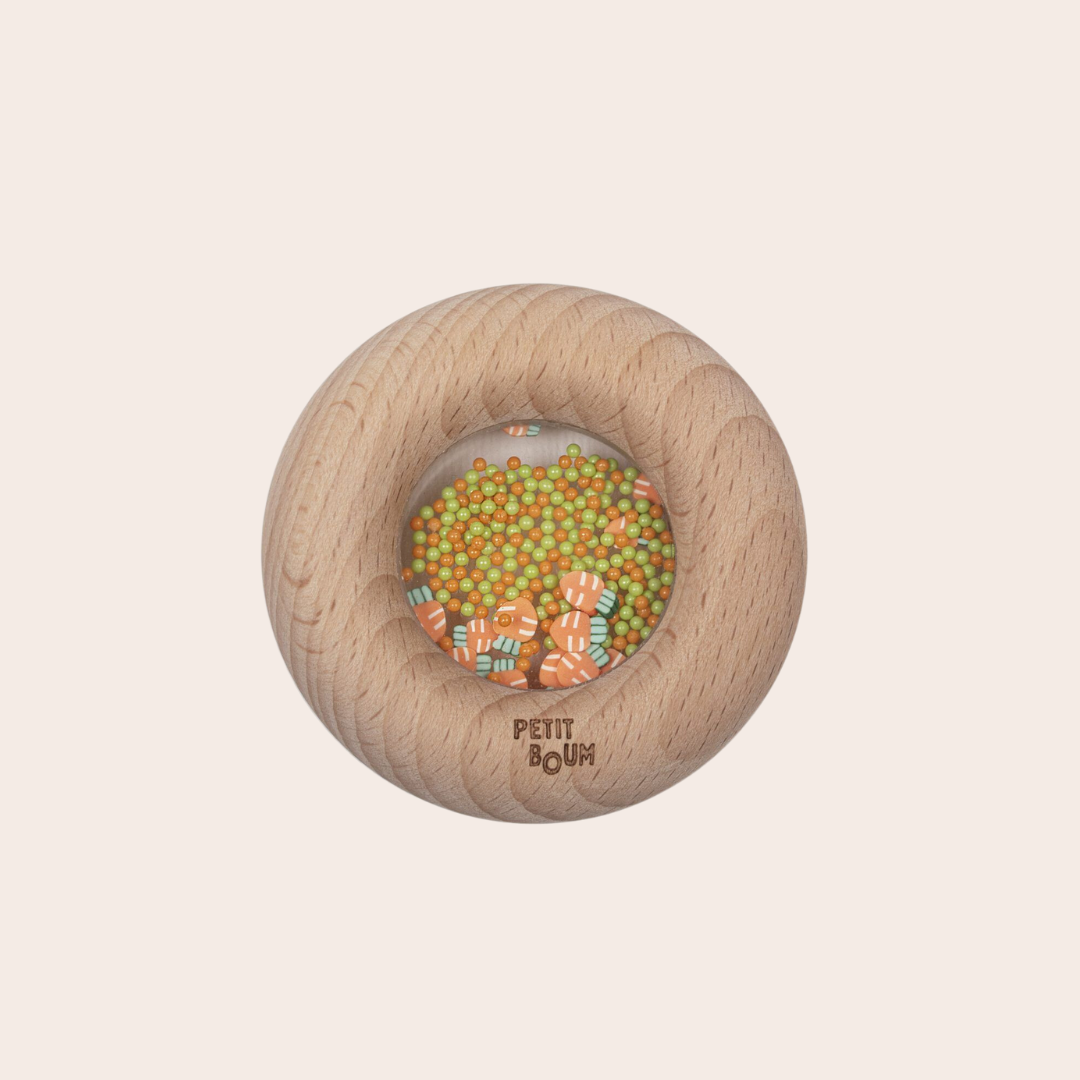 Nuestro sonajero de madera en forma de donut de Petit Boum es ideal para los más pequeños. Con figuras de frutas y verduras en su interior que suenan al agitarlo, este juguete sensorial estimula los sentidos y la curiosidad. Fabricado en madera de haya, libre de tóxicos y seguro para mordisquear, es perfecto para manos pequeñas. ¡Descubre este divertido y seguro sonajero en Ecotribu!
