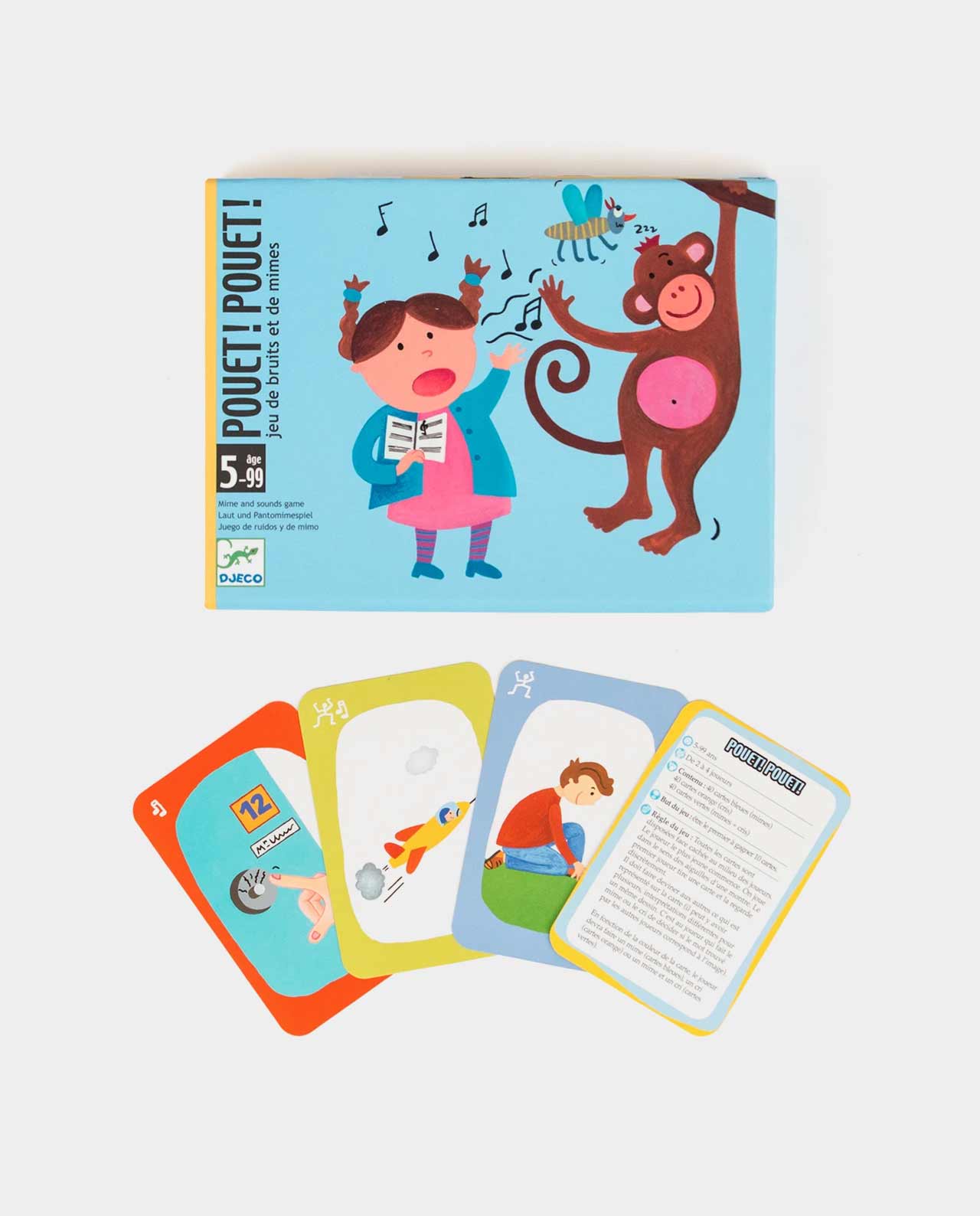 Pouet! Pouet! es un juego de cartas muy expresivo que trata de adivinar, mediante mímica, ruidos o los dos a la vez, los personajes y acciones de las cartas. ¡Risas garantizadas!