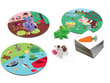 Se colocan los 3 universos encima de la mesa. El adulto saca una carta de un elemento que corresponde a cada universo. El niño debe colocar lo antes posible el animal correcto en el universo que corresponde a este elemento. Por ejemplo, si saca una zanahoria, el niño tiene que colocar el conejo en el huerto. Si el niño hace la asociación correcta, gana un punto.