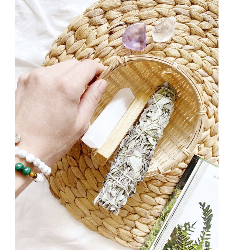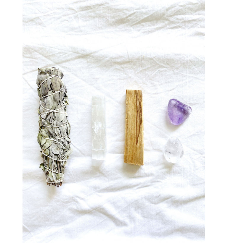 El kit de limpieza incluye: Un atado de Salvia natural (usado como purificador, limpiador), una vara de Palo Santo (considerado chamánico, es equilibrante, expulsa malas energías), una vara de Selenita, un rodado de Amatista y un rodado de Cuarzo Cristal (limpiadoras naturales).