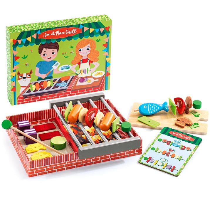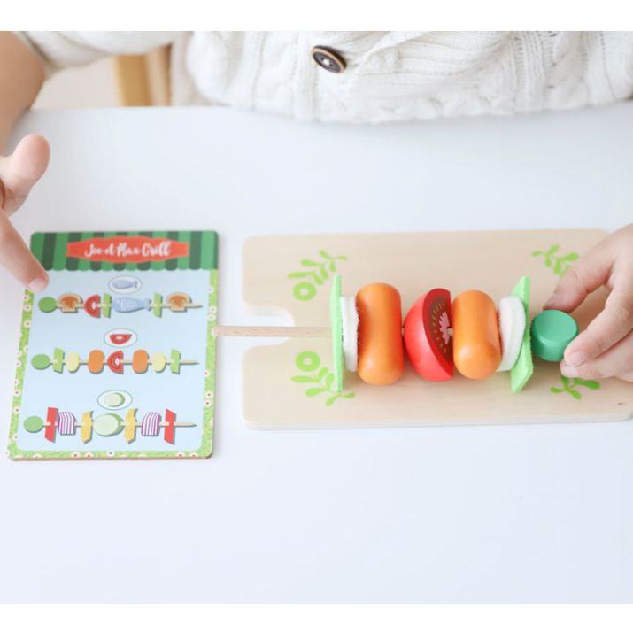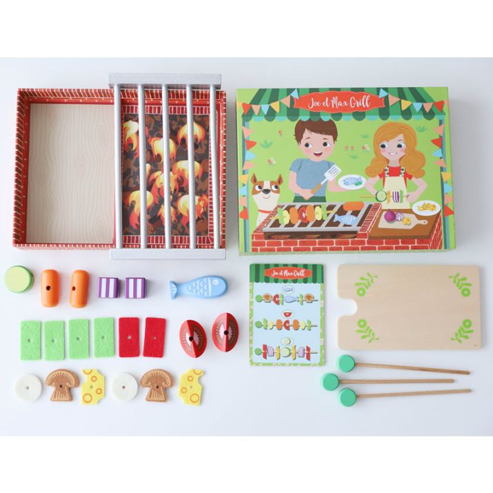Contenido: 1 tabla de madera, 3 pinchos de madera, 1 carta de menú de madera, 20 alimentos (madera y fieltro).