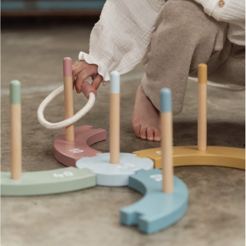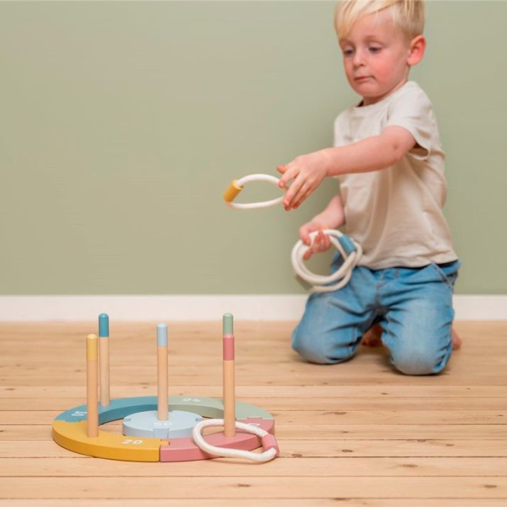 Jugar a este clásico juego de lanzamiento de aros desarrollará la coordinación mano-ojo de tu pequeño, la estimación de distancias y la puntería precisa.