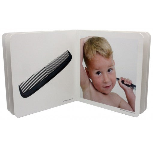 Libro de fotografías con imágenes reales de las rutinas y hábitos de los más pequeños. Para que niños y niñas se familiaricen con las actividades más comunes del día a día. En la página de la izquierda se muestran los objetos o elementos necesarios para la actividad, y en la de la derecha la actividad en sí misma.
