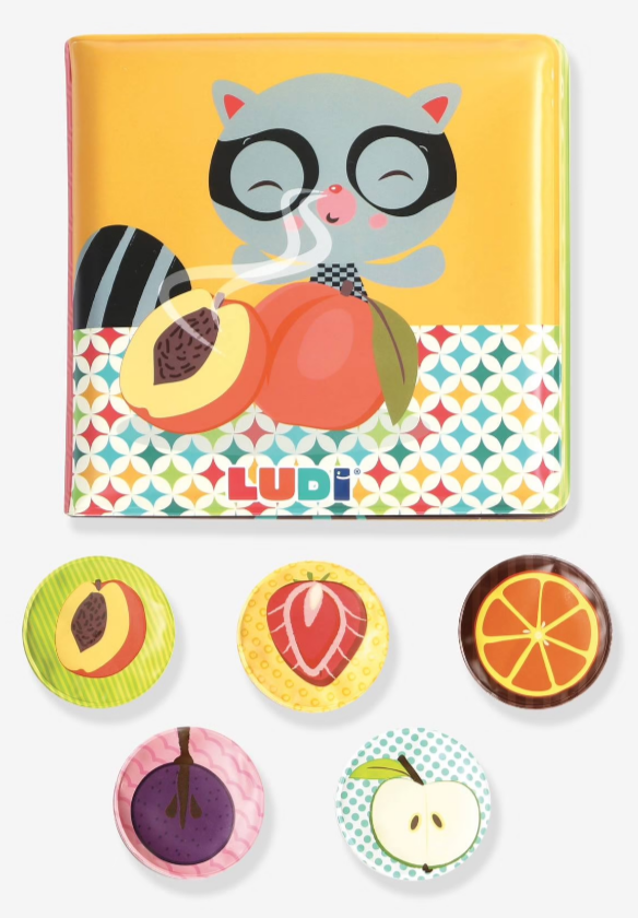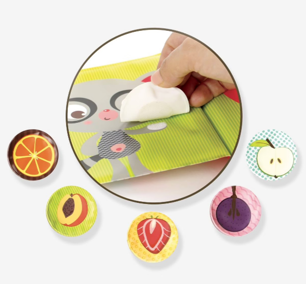 El set contiene un libro y 5 frutas aromáticas. Fabricado con materiales seguros y resistentes, es ideal para manos curiosas a partir de los 12 meses. ¡Diversión educativa para explorar el mundo de los sentidos!