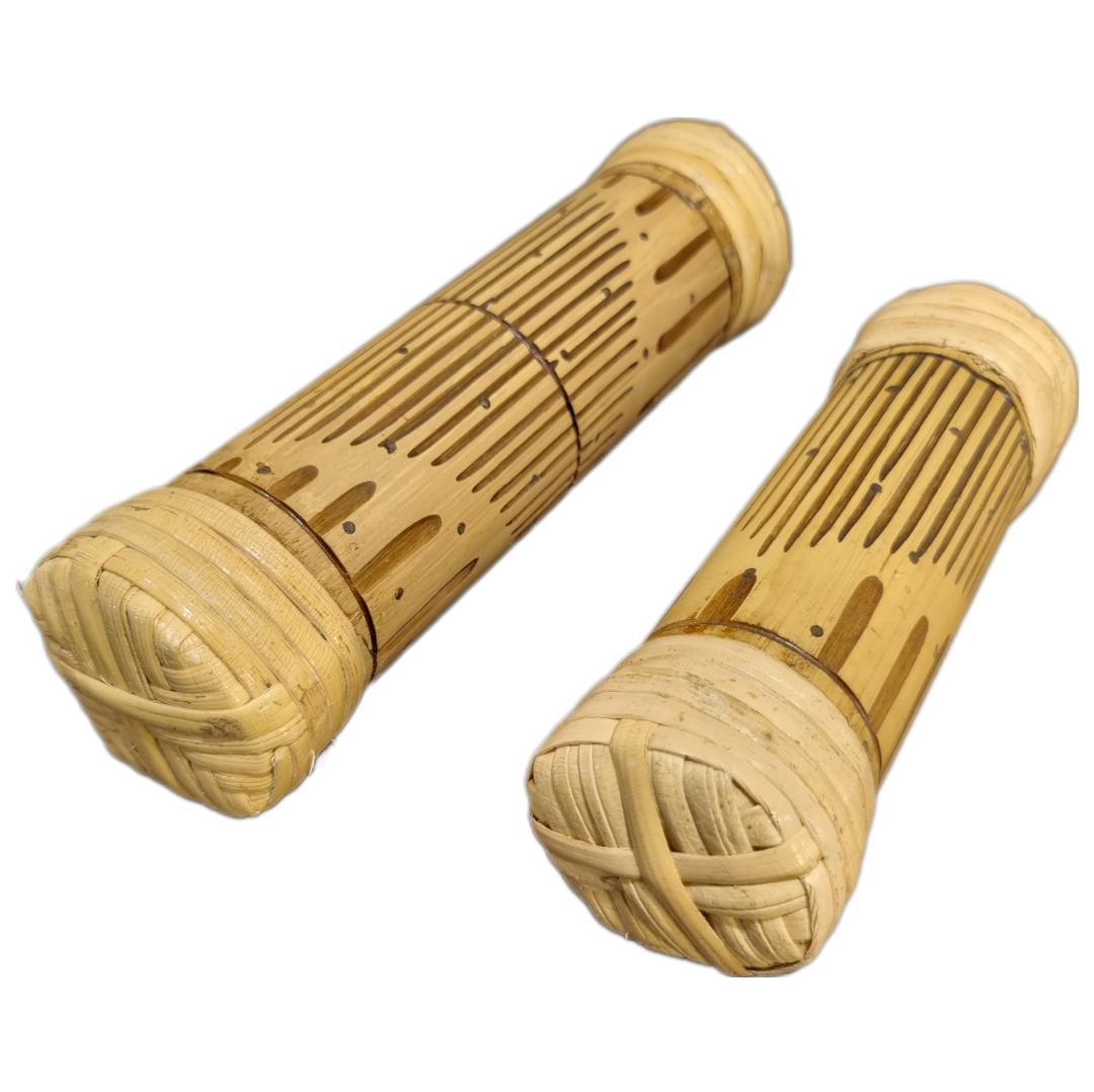 Este palo de lluvia está hecho con una caña de bambú rellena de piedrecitas que, al girar el palo, caen poco a poco golpeando los obstáculos que se encuentran a su paso y produciendo un relajante efecto de lluvia.