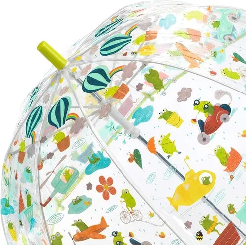 Paraguas transparente con bonitas ilustraciones de ranas. ¡A los niños les encantará este paraguas cuando esté gris y llueva fuera! Su forma de cúpula ayuda a resguardarse del viento.
