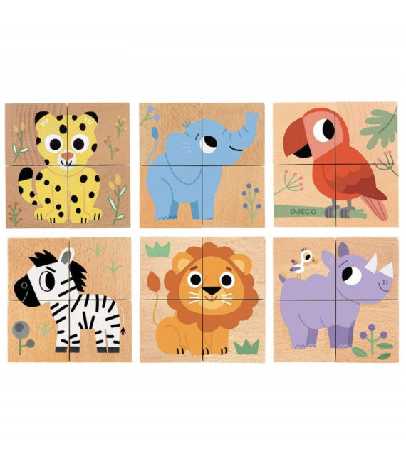 Un rompecabezas con 4 bloques de madera con temática de animales salvajes. Los peques tendrán que ir girando los cubos hasta dar con las 4 caras que conforman cada animal: un elefante, un león, un loro, una cebra, un tigre y un rinoceronte.