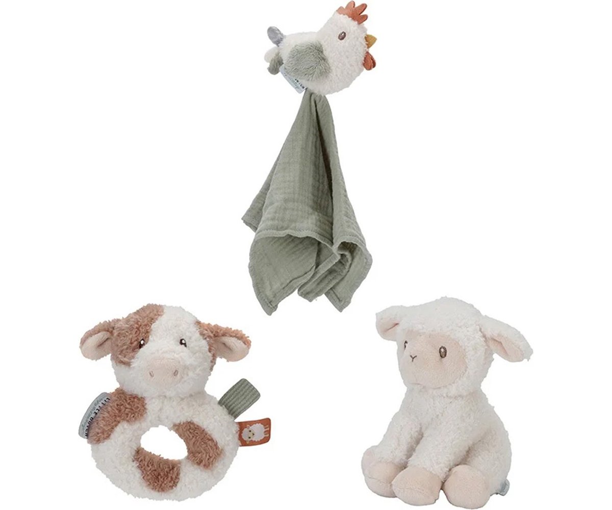 Incluye un dudú de gallo súper achuchable para acurrucarse con él, un peluche de oveja que será el mejor amigo del peque y un sonajero de vaca para eatimularlo auditívamente.