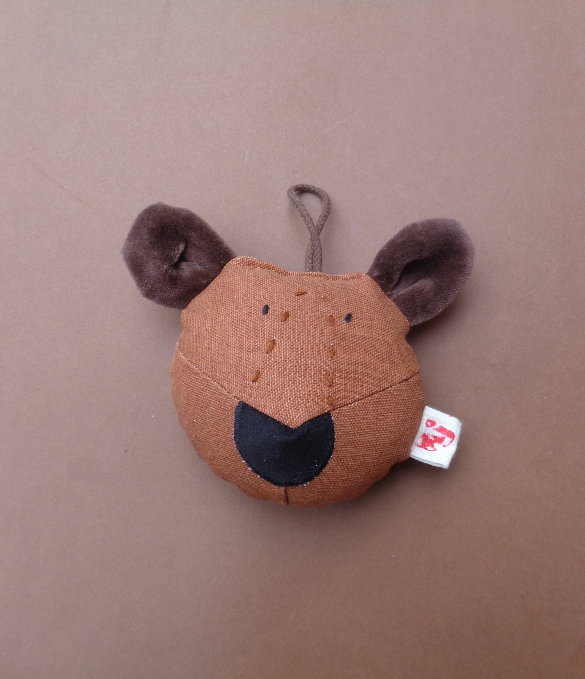 Disco sonajero en el interior para estimular la audición, impreso a mano con pigmentos ecológicos a base de agua en lona de algodón 100% oeko tex, nariz de terciopelo suave, relleno hipoalergénico de poliéster 100% reciclado.