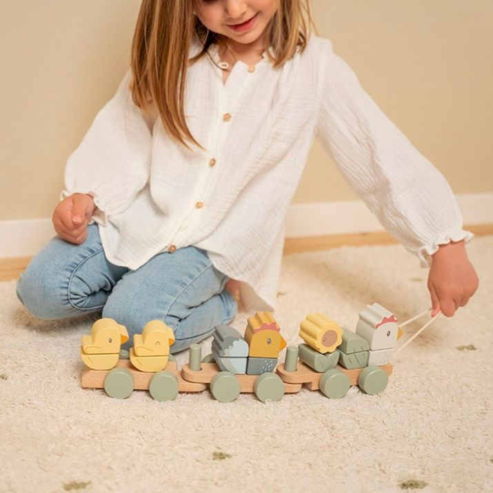 Las piezas pueden combinarse entre sí para formar vagones diferentes y colocar a los miembros de esta familia en distintas posiciones cada vez.