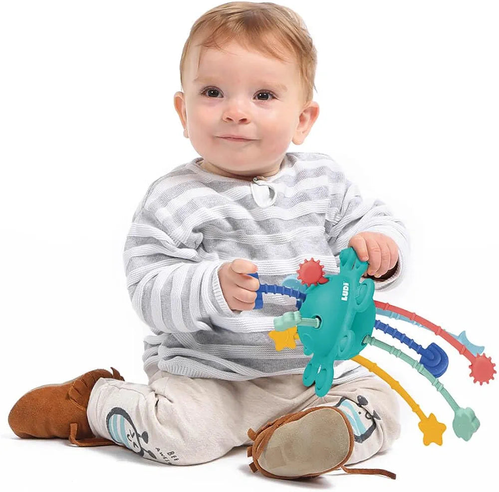 Este juguete sensorial ayuda a desarrollar la motricidad fina del bebé y entrena la coordinación mano-ojo.